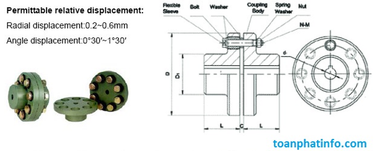 Gồm hai mặt bích (flange) được bolted (bắt bu lông) với vòng đệm đàn hồi giữa chúng.